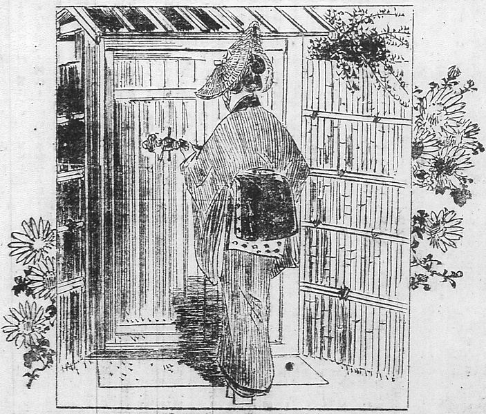 | 説明 | 門付けの女。本文では廃業した娼婦の哀れな行く末として法界節(ホウカイブシ)謡いとしている。この被り物は鳥追い笠で、顔を挟むようになっているので人目を避けやすく、女性が人前で歌ったり踊ったりする場合には都合がよい。阿波踊りではよく知られている。ほんらいは正月に出てくる門付けだが、乞食扱いされてもいた。(大丸 弘) |