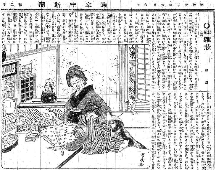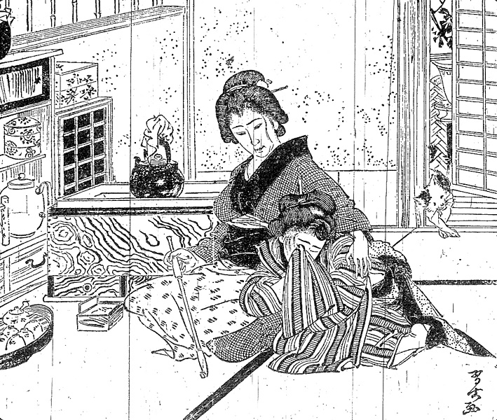 キーワード 黒襟;長煙管(きせる);袖口で涙をぬぐう;火鉢;薬缶(やかん);猫