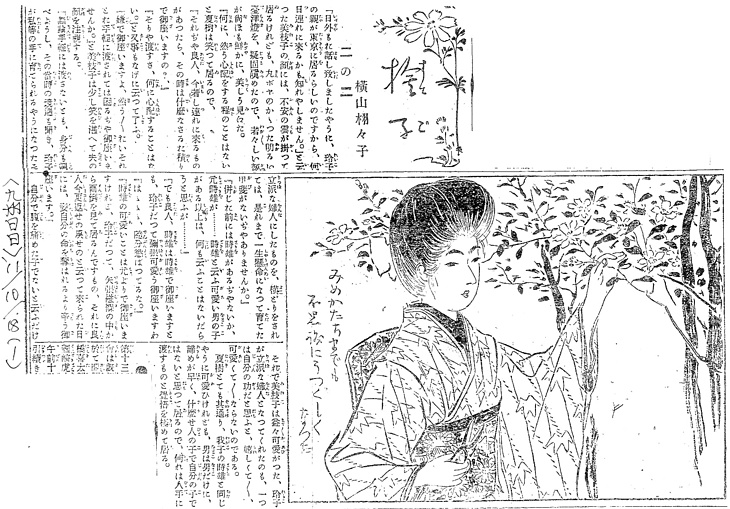 説明 捨てられた子を育てて立派に成人させた――。「氏より育ちとは能く云ったもので(……)気品と云い、性質と云い、容貌(ミメカタチ)までも不思議に美しくなったので、香川家の令嬢と云っても恥ずかしくないように、立派に育てられた」、その娘が庭先の花樹の、小枝を摘んでいる立ち姿。束髪だが、廂髪(庇髪)(ヒサシガミ)というほど前には突き出していない。束髪は1890(明治20~30)年代には、一部の知識階級の女性などに結われていた。その時代は鬢(ビン=横髪)は張らせず、縦に長い形で、頭に引っついたような感じだった。前を高く膨らませたのはいわゆる下田歌子式であり、そのあと、同じタイプの花月巻の大流行があった。明治末のこの時代では、全体にもっと梳き毛を入れて、ドーナツ状に張り出させるのがふつうだった。その点からいえば、この娘のスタイルはやや時代遅れともいえるし、おとなしいといえるのかもしれない。彼女の帯は立て矢結びらしい。娘が十六,七までのときは、ふくら雀か文庫、立て矢に結ぶが、その中で立て矢はやや堅く、大仰な感じになる。(大丸 弘)