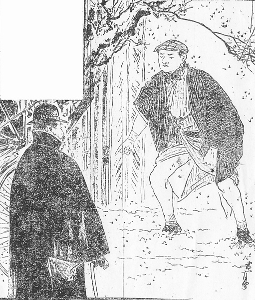 | 説明 | 女を追って門内に飛び込んできた警視庁の探偵と称する男。「二十四五の男で、鳥打帽子に縞の羽織、めりやすの股引半靴という扮装(ミナリ)」。刑事のこの恰好は挿絵にもしばしば登場するが、こうした私服の場合は袴を穿くようにと、警視庁は求めていた。向かい合っている「二重マントの紳士」はこの邸の主。山高帽を被りステッキを突く。二重外套を二重マントと呼ぶのはめずらしい。たいていはインバネスとかトンビ、あるいは二重廻し。そのトンビの羽根の下から、下に着た和服の細かい縞の袖が覗いている。袂の先っぽだろう。(大丸 弘) |