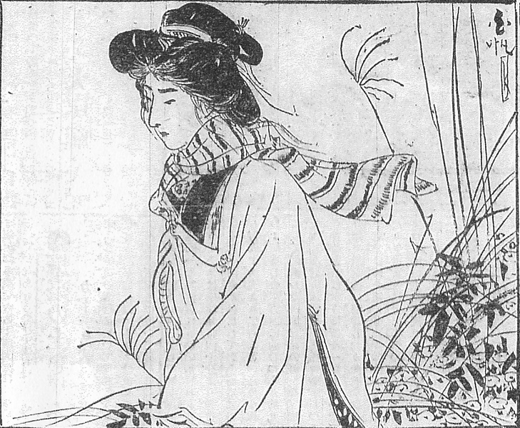 説明 温泉地を廻って、懐具合のいい宿泊客を狙う女賊。第8回では山間の共同浴場の男湯に浸かっている。このあと、たまたまここに来た旅人が犠牲者になった。第24回では赤倉付近の林の中を、なにかを求めてさまよい歩く姿。「縫いのある縮緬シオルを頸に巻いて、御召コートの新しいのを着ている。これだけの扮装(ナリ)をするには、長野か、高田に出たに相違なかろう」とあるが、しかし「嶋田の髷は根が抜けてグラグラになって、乱れ毛には埃がついて、白く色さえ変わっている」。この女の髷は第8回も第24回もほぼ変わりなく、けっこう大きいが下に引いた芸子髷風。髷がぐらつくのは元結(モトユイ)が切れたり緩んだりするためで、たぶん烈しく頭を動かしたりしたのだろう。(大丸 弘)