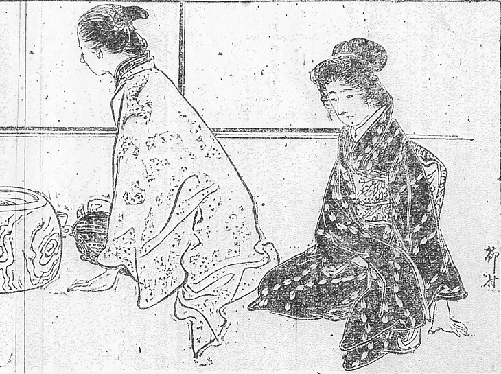 説明 悪人の追求から身を隠している母と娘。その匿ってくれている恩人の男に、娘を妻に迎えては貰えないかと、申し入れている母親。娘の気持ちはもうじゅうぶん確かめているのだろう。唐人髷に結っている娘は母のうしろですこし身を捩って畳に手をつき、顔を伏せて袂をなぶっている。母親は前髪の全くない老人風の小さな島田。いつものことながらこの時代の物語では、娘と較べて親が不自然に年をとりすぎている。母親が片手をひざに置き、片手を畳に突いているのは、辞を低うしてなにかを頼んでいるのではなく、相手の身上、また気持について尋ねてみる、という心持ちであるためだろう。(大丸 弘)