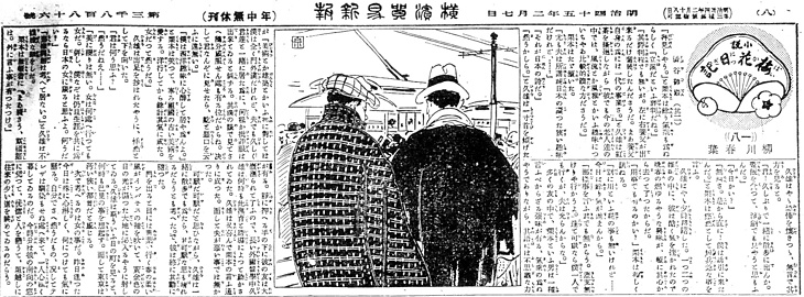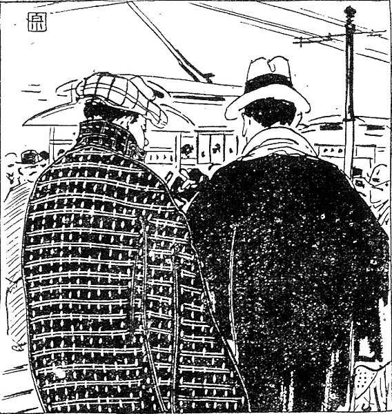 説明 「行く春の柔らかい風がインバネスの袖を吹いて(……)」という青葉若葉の頃、第18回では、電車の近くにも同じく二重外套を着た年配者の後ろ姿がある。第19回では、脱いで手に持っている男を入れて、上野へ展覧会見物に来た三人の男のすべてが二重外套。1910,1920年代は、二重外套の一枚を持たない人はめずらしいほど、冬場の盛り場の人混みは二重外套の人で溢れた。二重外套は和服の上でも洋服の上でも用いられたが、やはりどてらのほかに適当な防寒衣服のないきものにとっての方が必需品だったので、男性がきものを着なくなるのと比例して、二重外套を着る人が少なくなった。(大丸 弘)