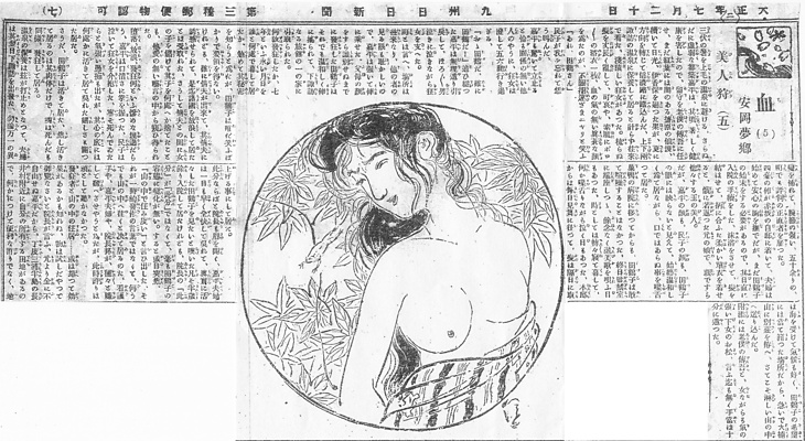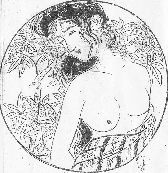説明 この時代ではめずらしいヌードの一例。主人公が信州の温泉地の往来で出逢った狂女。男とともに各地を流れ、そのあいだに生んだ子を捨てたということだけが、断片的に推測されるという。故郷に戻ってきて、素肌にボロボロの浴衣一枚であたりをさまよい歩いている。よどみのない線で描いているが、乳房は丸ければいいだろう、という風。(大丸 弘)