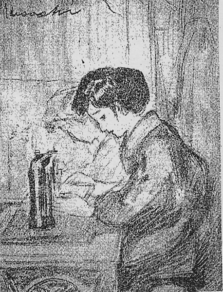 | 説明 | ミシン仕事に励む娘。縫製工場のミシン女工は、若い女性の有力な職業のひとつだったが、家庭で内職にミシンがけをする人も少なくなかった。欧州大戦後の好景気時代、子どもに夢を託して買ったピアノが、弾き手もないままに放置されている家が多かったように、ほとんど使われていないミシンが東京の上中流家庭に五,六万台はある、と言われた。しかし、自分でミシンが買えるような家は、また内職の必要などないのがふつうで、このお嬢さんも、帯に古代切れをアプリケして呉服店に卸し、高級な客の需要を期待する、というアイデアから出発している。しかし、当時の素朴な家庭用シンガーミシンに、そんな機能があったのだろうか。女性たちは和装コートを着てミシンを踏んでいる。防水もある和装コートは、塵除けとして四季愛用されていたので、糸屑の出るような作業にこれを着るのは、理に適っている。女店員が仕事時の制服として、和装コート風の上っ張りを広く着るようになるのは、もう少しあと。(大丸 弘) |