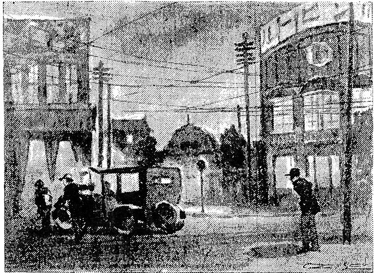 説明 東京・上野、池之端に近い電車の停留所の近くと言うが、辺りは暗い。明治時代の広小路辺は、夜は提灯がなければ歩けなかったという。1928(昭和3)年のこの時代、まさかそれほどではないにせよ、夜遅くまで路を照らしている商店の数も少なく高さも低い。街灯も遠くの方に一基、それらしいものが見えるだけ。東京・大阪のような大都会の、都心の、電車が通っているような大通りですら、第二次大戦前の夜は、空も、街も、本当に暗かった。だから乏しい灯が懐かしかったろう。(大丸 弘)