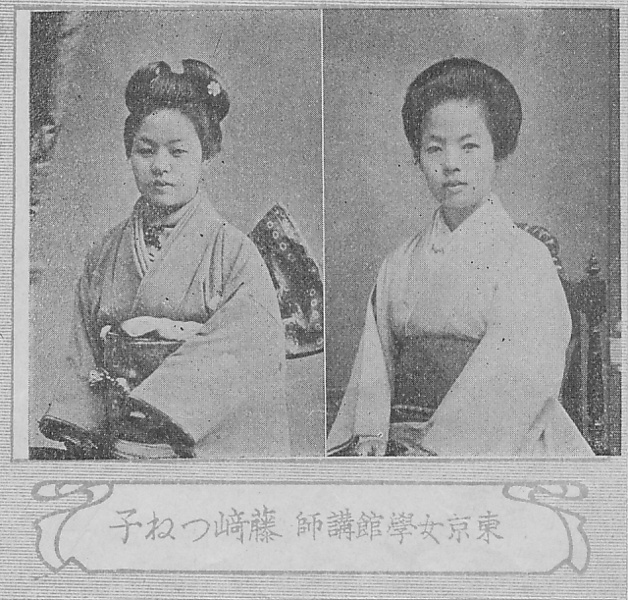 | 説明 | 東京女学館講師、藤崎つね子。左側は1889(明治22)年頃の写真。右側は1908(明治41)年頃の出典資料発行当時の写真。 |
