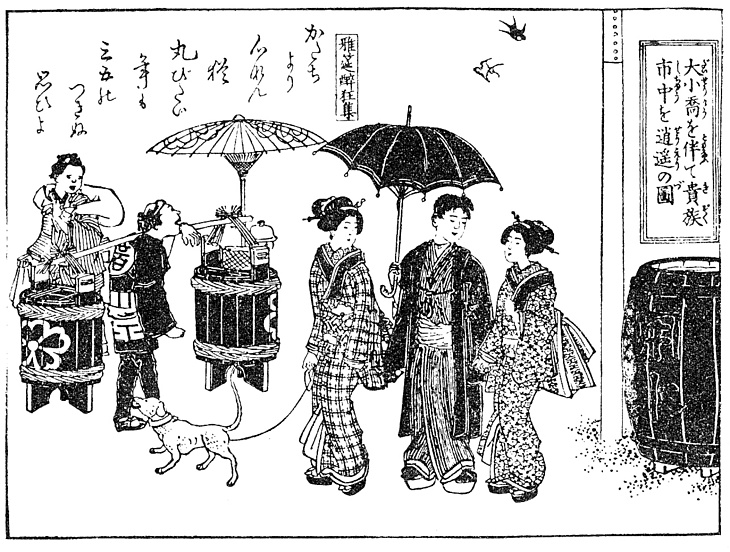 | キーワード | 明治初期絵双紙;兵児帯;木履;ぽっくり下駄;洋傘;蝙蝠傘;こうもり傘;犬;犬の首輪;犬の散歩 |