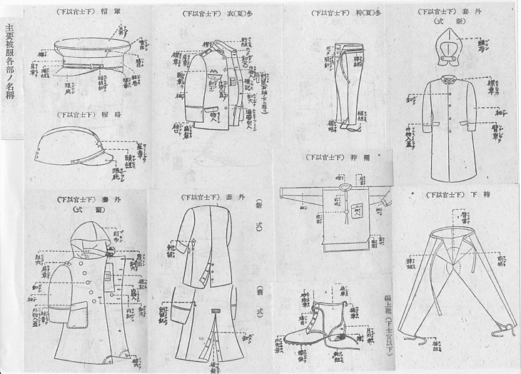 タイトル 主要被服各部ノ名称:外套/冬(夏)袴/冬(夏)衣/軍帽/袴下/襦袢(いずれも下士官以下)