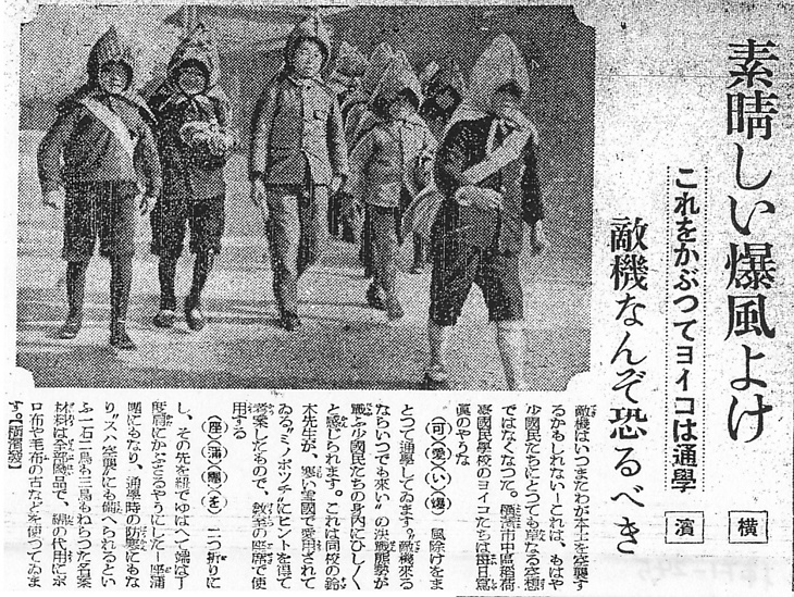 | タイトル | 素晴しい爆風よけ:これをかぶつてヨイコは通学 敵機なん恐るべき |