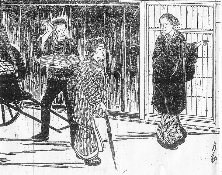 | 身装画像コード | D006:[初老の女性(40~50歳代)] D2:[ヘアスタイル] Vhi:[被布] D004:[適齢期の娘;新造;(1) 嫁入り前の娘,新妻,さらに一般の他家の妻女をいう。] D2ni:[日本髪一般] Wkas:[傘] D4ji:[人力車夫] Wta:[タオル;手拭い;手拭い被り] Wfu:[風呂敷(包み);布包み] G790:[人力車] |