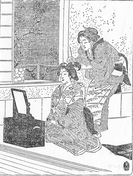 | 説明 | 出入りの髪結に丸髷を結わせている女。女は後添えでまだ若く、それで文中の「早く丸髷の似合うように年をとりたいと思うわ」というような台詞が出る。丸髷は明治・大正期には既婚女性の結う髪として固定し、大人の色気のある髪とされたが、なかには似合わない人もあって、そういう人は銀杏返しか、束髪にした。しかし島田となるとこれはお嬢さんの髪だったから、ごく若い奥さんのなかに少数、それも結婚してわずかの期間だけ、夫かお姑さんの特別な好みで結う人があるくらいだった。ここで髪結が心のなかで、この奥さんは唐人髷の方が似合いそう、と考えているというのは、よほど娘娘した女性なのだろう。唐人髷や桃割れは、島田よりもうすこし若い年頃に結う髪。(大丸 弘) |