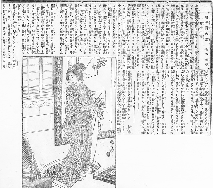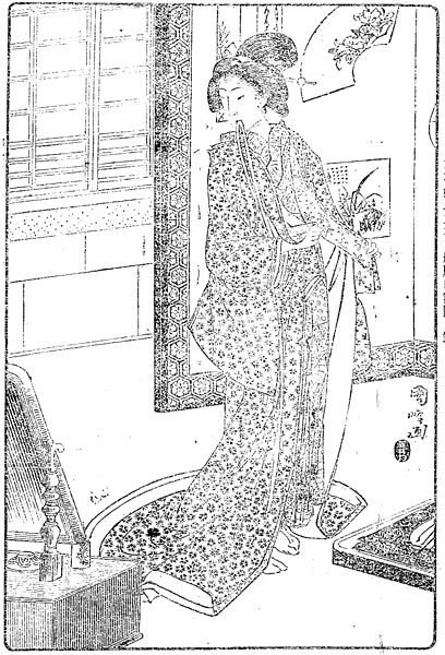 説明 軍事探偵もののうち、清国の軍事探偵が出征日本軍人の妻にとりいって情報を得ようと試みるもの。それと察した妻は相手を欺くため、ふだんの質素な姿と違い、「きょうは胸に一物あれば、石鹸(シャボン)も使い卵糠も使い、やがて化粧も入念に施して、帯も衣服も就中美々しきを着し、姿鏡(スガタミ)に対して幾たびか衣紋を繕い、一口(ヒトフリ)の匕首を懐に呑ませ」という場面。この妻は征清中の夫を思い、顔も垢つくに任せ、たまの湯浴みのおりもシャボンなんぞを使用したことはない、という貞女。卵、糠とは、卵の白身は顔を滑らかにするために用い、糠は石鹸以前の時代の洗い粉。足もとにあるのは乱れ箱。夜、寝間着になったときなど、脱いだきものは軽く畳んでここに入れておく。(大丸 弘)