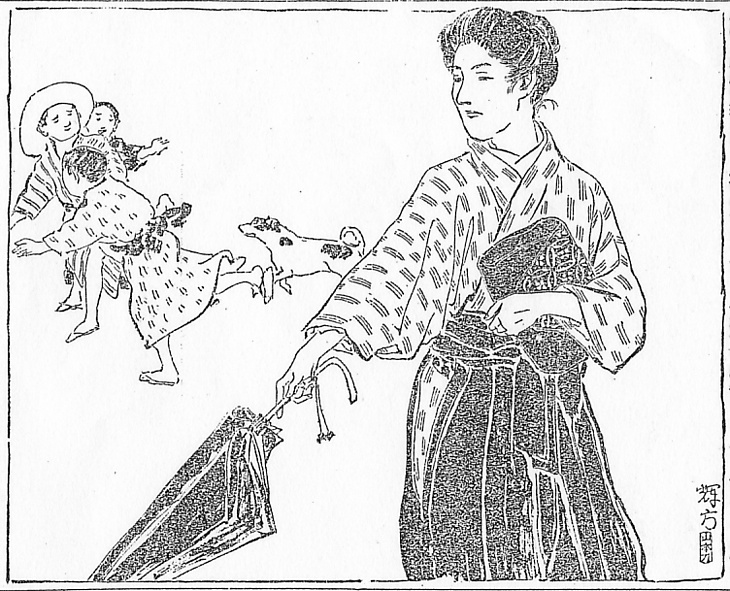 | キーワード | 小学校教師;束髪;引っ詰め髪;ひっつめ髪;筒袖のきもの;飛白の単衣;丸袴;行灯袴;洋傘;蝙蝠傘;こうもり傘;犬 |