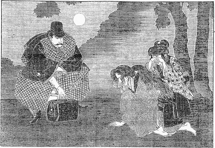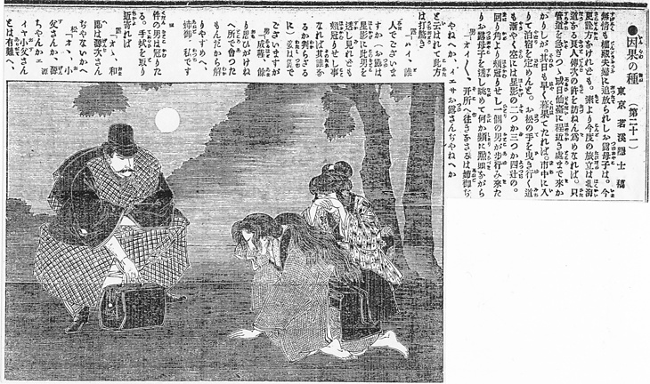 キーワード 山高帽子;八字髭;[インバネス;トンビ;鳶(とんび);二重回し;二重廻し;二重外套;二重マント];革かばん;しゃがむ
