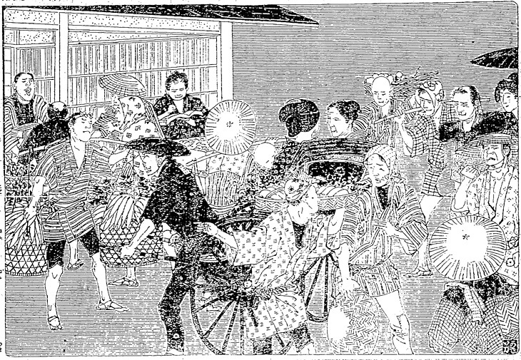 | キーワード | 群衆;頬被り;頬かぶり;ねじり鉢巻き;半纏;腹掛け;籠;天秤棒;天秤担ぎ |