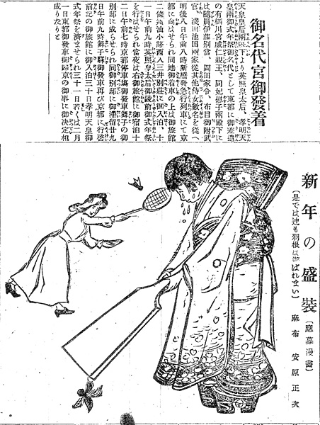 | キーワード | 新年の盛装;和装と洋装の対比;羽根突き;バドミントン;挟み結び;御挟み(おはさみ);木履;ぽっくり下駄 |