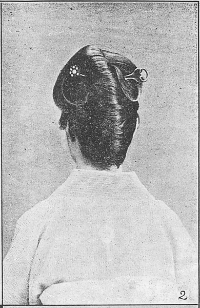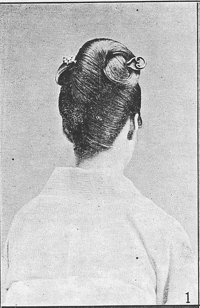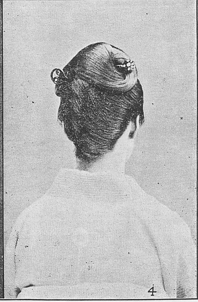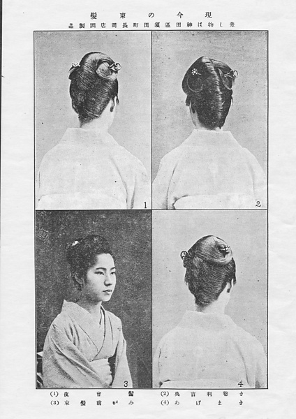 説明 「差し物は神田区須田町長岡店調整品 (1)夜会巻/(2)英吉利巻き/(3)束髪前がみ/(4)あげまき」。