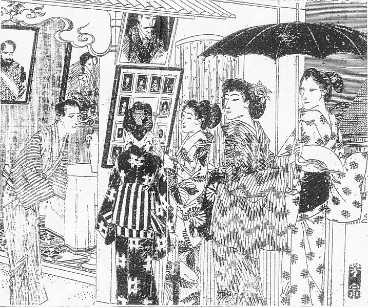 | 説明 | 写真館の店先は、この時代、役者のブロマイドでも見るような興味の、通りすがりの見物人が多かったらしい。写真ということばが定着する以前は、写し絵という言い方もあったようだ。手前に母親といる束髪の娘を、左側の唐人髷の下町娘たちが、「御覧なねえ束髪でほんとうに生意気だアね、あれがネちっとばかり学校で勉強して本が読めるもんだから厭にツンツンしているよ、オヤあれが桜木さんのお嬢さん、あんな犬の糞のような髷は厭だねエ(……)」とくさしている。束髪娘の父親は高等官。(大丸 弘) |