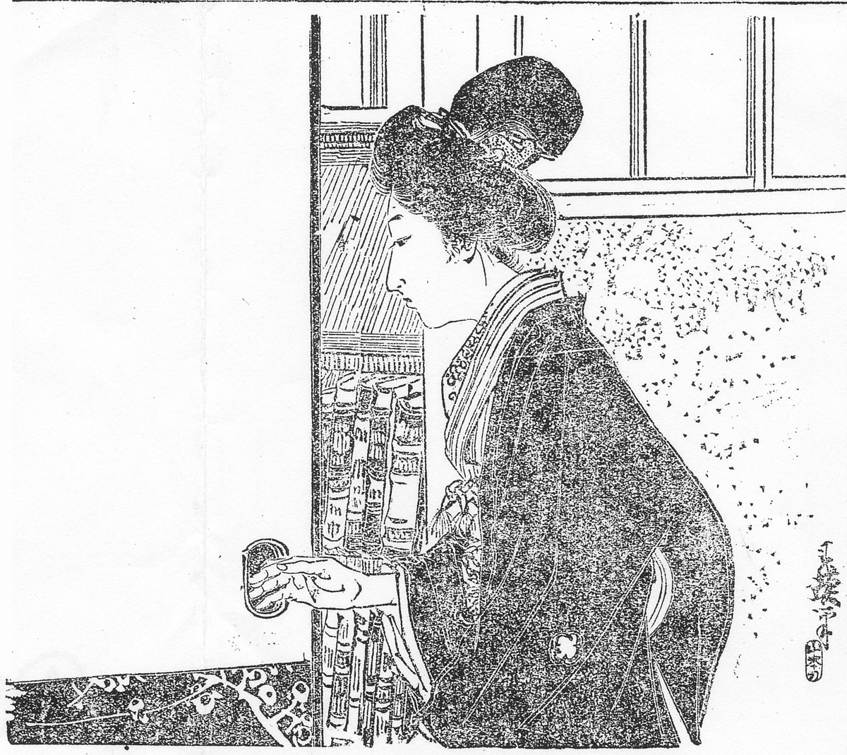 | 身装画像コード | D004:[適齢期の娘;新造;(1) 嫁入り前の娘,新妻,さらに一般の他家の妻女をいう。] D2ma:[丸髷] Vhao:[羽織] Vhan:[半襟] H34:[デスクワークのための設備;書斎] |