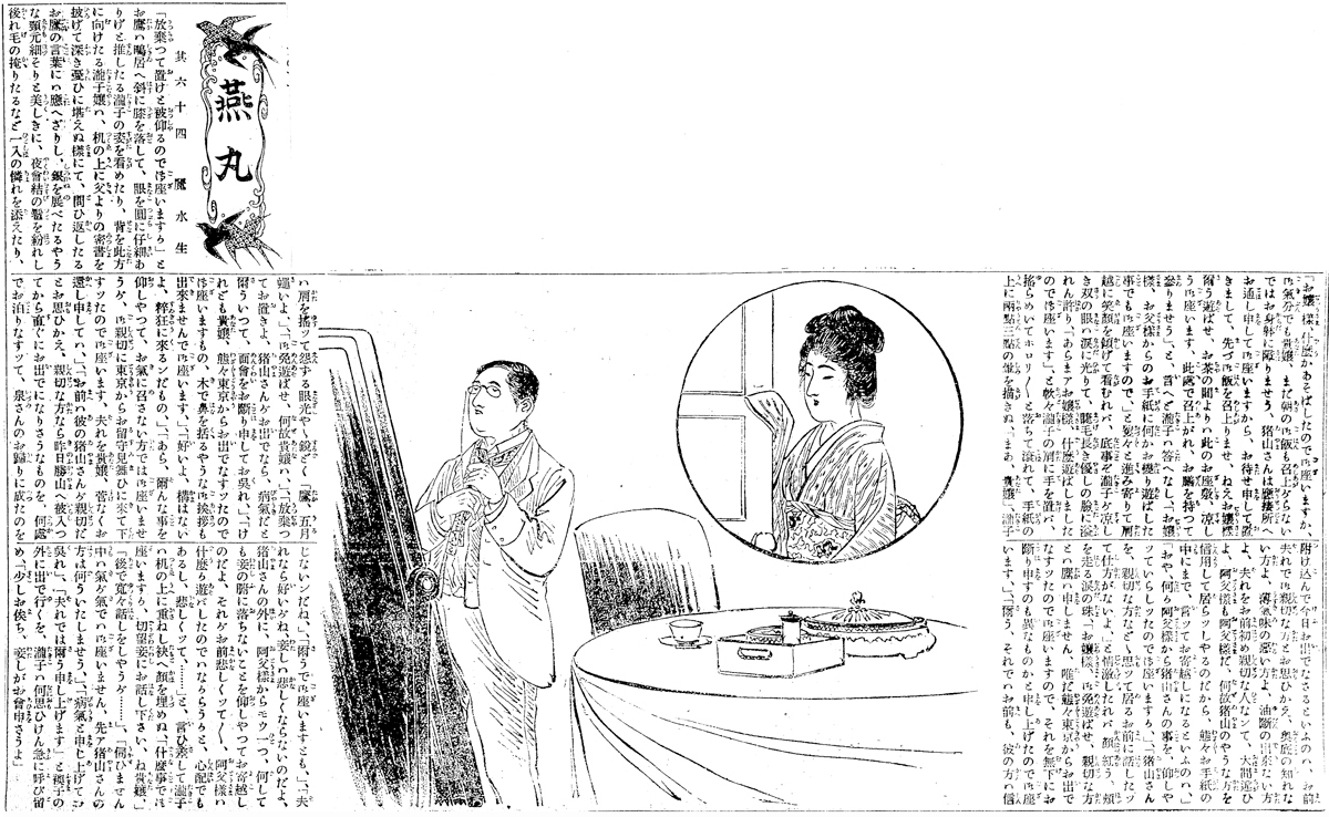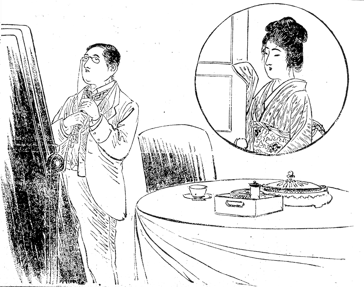 | 説明 | 自分に逢うために遠路はるばる訪れた今風のハイカラ紳士を毛嫌いして、出渋っているお嬢様。なかなか現れないお嬢様を待ちあぐねて、紳士は鏡の前でネクタイを直している。彼のかけている鼻眼鏡は19世紀の欧米ではけっこう使う人がいて、わが国でも明治期には真似る人があったが、鼻梁で挟むことが日本人向きでないためもあり、長続きしなかった。お嬢様は、「銀をのべたるような襟もとほっそりと美しきに、夜会結びの鬢を紛(ホツ)れし後れ毛の掩(カカ)りたるなど、一入(ヒトシオ)の憐れを添えたり」とある。この時期の束髪は縦型で、夜会巻もその一種だが、夜会結びと称してこの挿絵に描かれた髪はふつうにいう夜会巻とはちがう、めずらしいスタイル。(大丸 弘) |