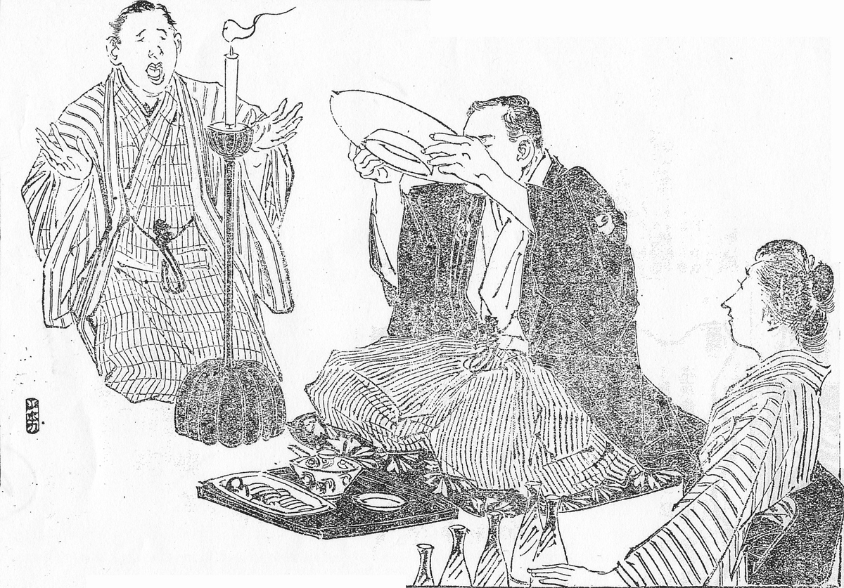 | 説明 | 夷講(エビスコウ)は商家の大事なお祝いだが、伊丹出身の大阪のある酒造家では稼業柄もあって、強引な献酬と呑み自慢の一夜になる。こういう宴になると徳利も一合入りなど使わずに二合入り、盃も五合入り六合入りという大杯が回される。いましも招かれた客の一人が七合入りの盃の一気飲みを誇っている。上座に着いているこの客は「黒紋つきの羽織に仙台平の袴」という正装で、汚れやシミの目立つ無地のきものだったから、とりわけ体から遠いところに食べ物も飲み物も供される平膳の時代には、酒染みの手入れに女たちは頭を悩ました。かたわらで手を叩いて囃し立てているのはこの家の番頭。商家の使用人といえば縞のきものに決まっていて、番頭の身分になってはじめて羽織を許されるのがふつうだが、それもやっぱり縞柄。(大丸 弘) |