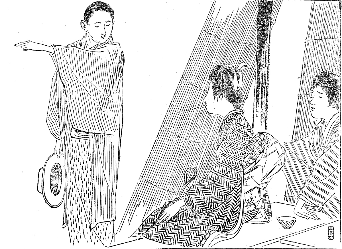 | キーワード | 男爵家の令嬢;上げ巻;イギリス巻風;お太鼓結び;横顔;側面;日傘;竪縞の羽織;パナマ帽;湯呑み茶碗;葦簀(よしず);立て簾(たてす);指を差す |