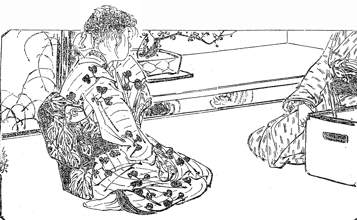 | 説明 | ヒロインの妹。姉より小柄で、器量は姉に劣らないが十六にしては初心(ウブ)な娘、とある。第13回では姉と向かいあって、袂を口元に当ててしゃべっている。第26回は病の篤い叔母の枕元で、看護している姉の後ろで横座りに座っている。横座りは第13回でもしていて、あぐらをかかない女性は楽居するときはよくこうするが、身体が崩れて恰好が悪いからむしろあぐらの方がまし、という意見もあった。きものや羽織にはまだ肩揚げがあり、髪はそれでも少女っぽいお下げではなく、てっぺんで小さく巻いているらしい。(大丸 弘) |
