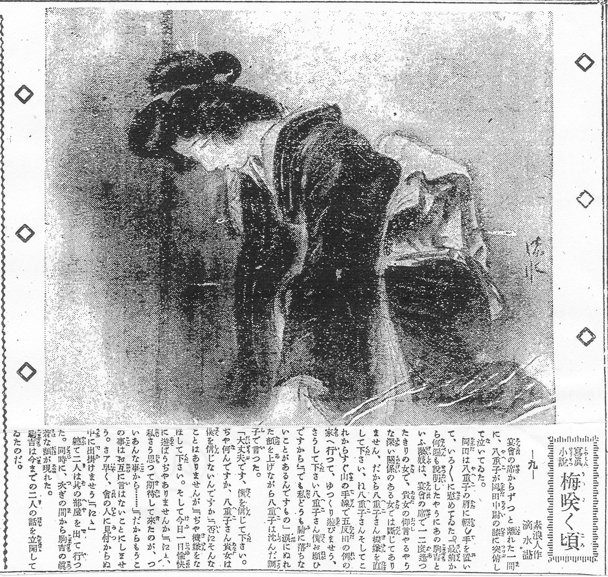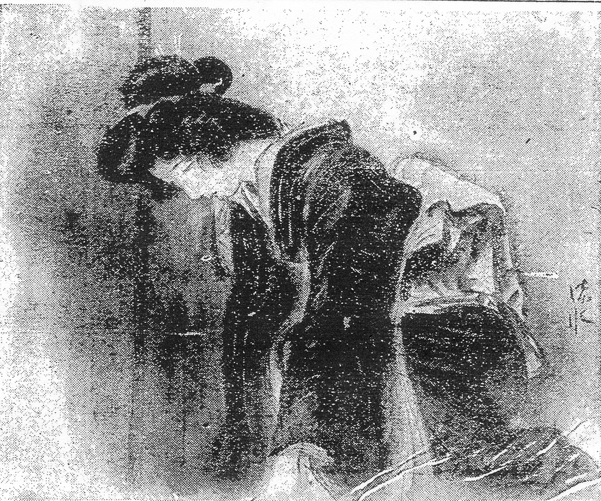 説明 日本画の老大家の祝宴に呼ばれた芸者のひとりは、画家の令嬢とある陸軍中尉とのあいだで三角関係になっていた。芸者とのあいだを疑われた中尉が、決してそんな関係ではないと令嬢に言い切るのを、つい立ち聞きしてしまった芸者は、がっくりして畳に手をついているのが第9回。宴会のことで、芸者は黒紋付き裾模様の出の衣裳。髪はふつうの高島田より髷の低い芸者島田。やや分かりにくいが右袖口を咬んでいるらしく、これは女の悔しさや怒りのきまった表現。第10回はその芸者がいよいよ自分が捨てられたと分かって、今度は畳に突っ伏して泣いているのを、事情を察した画家の弟子のひとりが慰めている。宴会がすでに終わり近づき、芸者も縞のきものに着替えている。(大丸 弘)