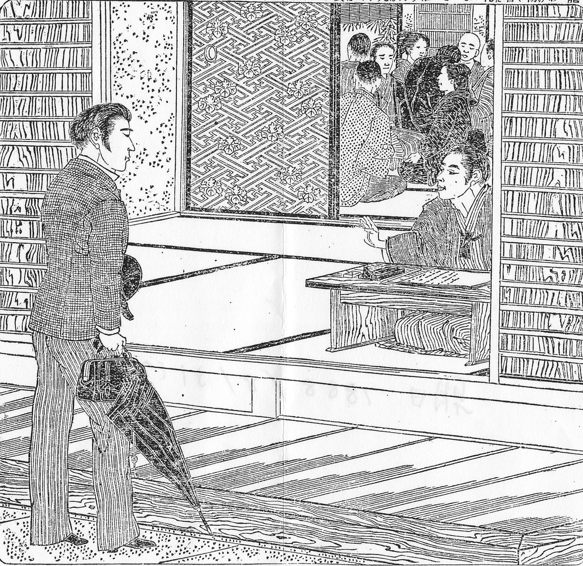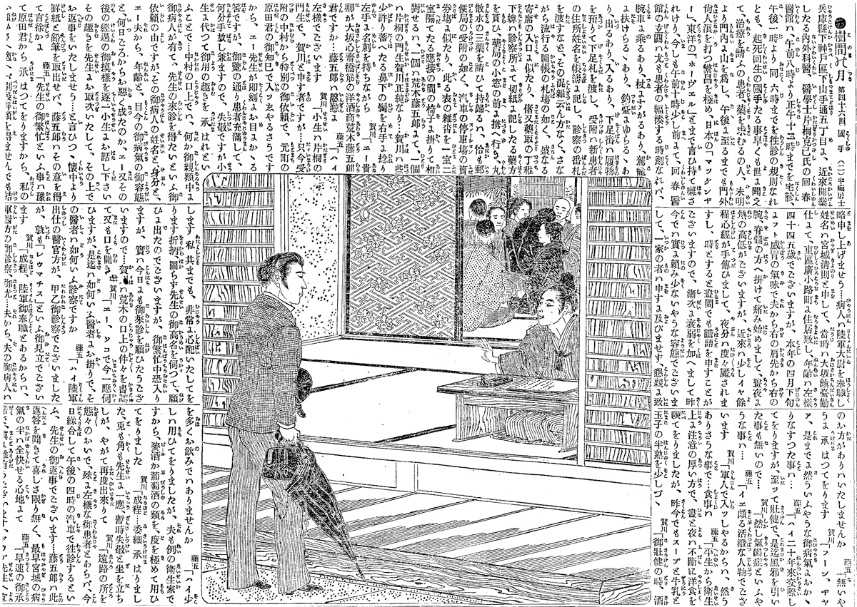 | 身装画像コード | H853:[病院;病室;医療施設] G023:[日本式玄関構え] D6se:[洋装;西洋化;西洋観;ハイカラ;西洋かぶれ;開化ぶり;西洋憧憬] Wbo:[かぶり物一般;帽子] Wkut:[靴;サンダル;靴修理;靴磨き] Wkas:[傘] |