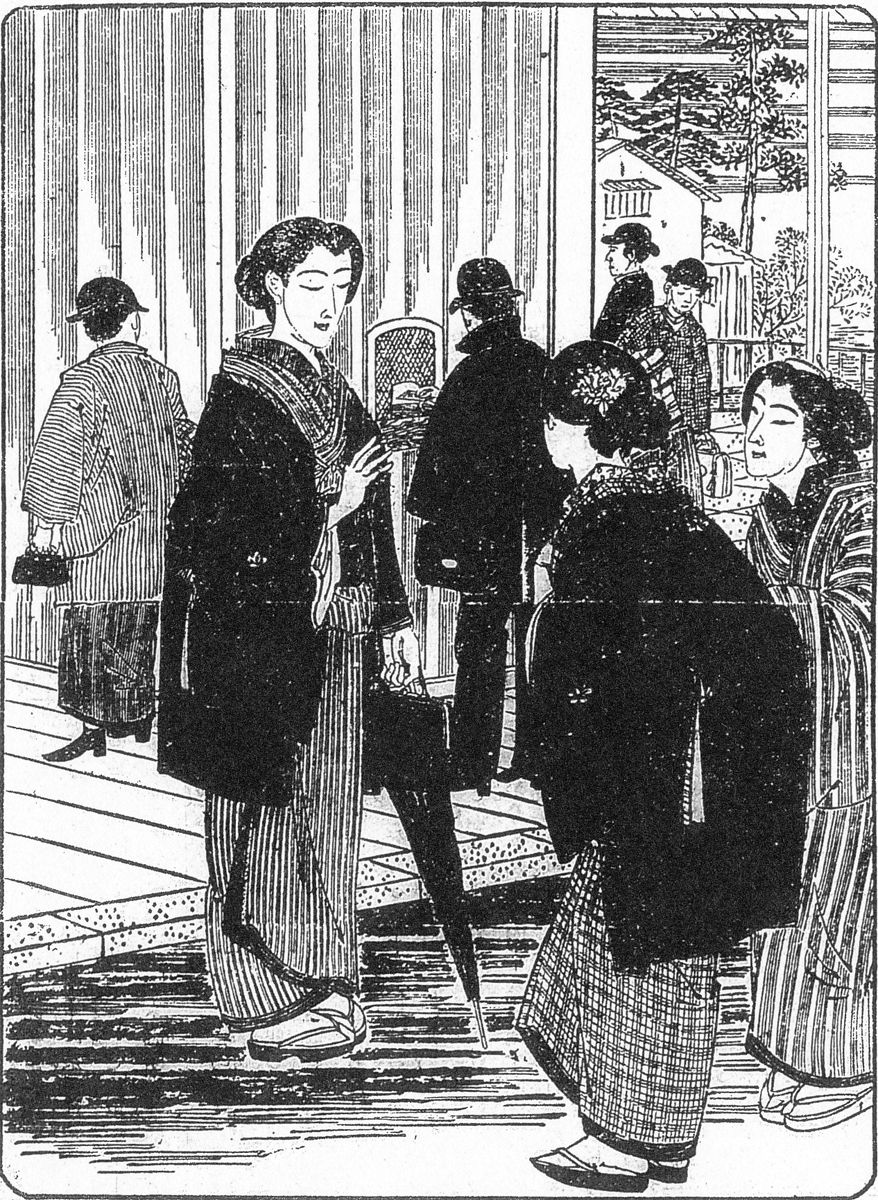| キーワード | 女教師;下げ巻風;竪縞のきもの;味噌漉縞(みそこしじま)のきもの;ぞうり;洋傘;蝙蝠傘;こうもり傘;中山高帽 |