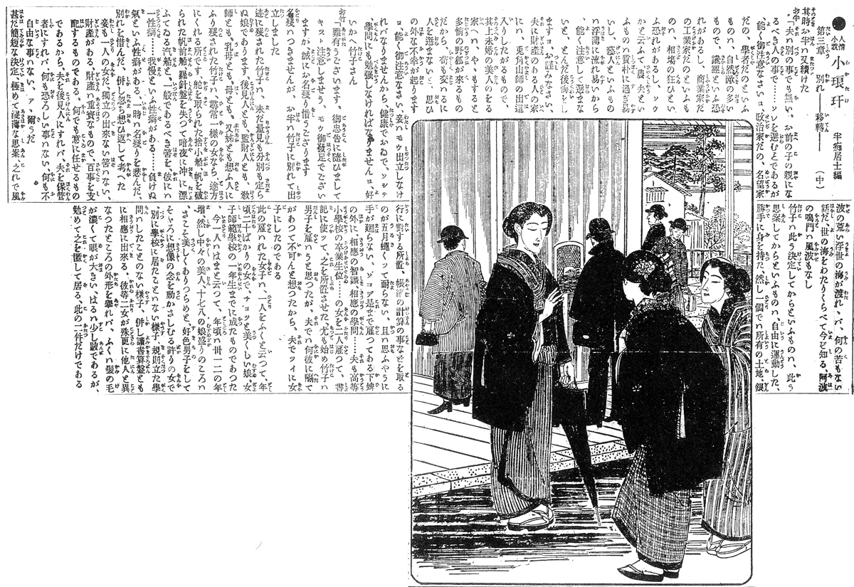 | 説明 | 若くして栃木県下の豪農の跡継ぎとなった娘。今日まで十年あまり、主人公の養育と教育に尽くしてくれた女教師との、宇都宮駅頭での別れのシーン。大宮~宇都宮間の鉄道が開通したのは四年前で、この時点では利根川はまだ渡し船だった。旅客の中山高帽と、手に鞄を提げているのが目立つ。教師と主人公はきものの前褄をぐいと引きあげて、帯に挟んでいる。すこし長い道を歩くには女性はたいていこうしていた。家ではまだ裾を曳いていた時代。教師と主人公の髪は下げ巻風の束髪。(大丸 弘) |