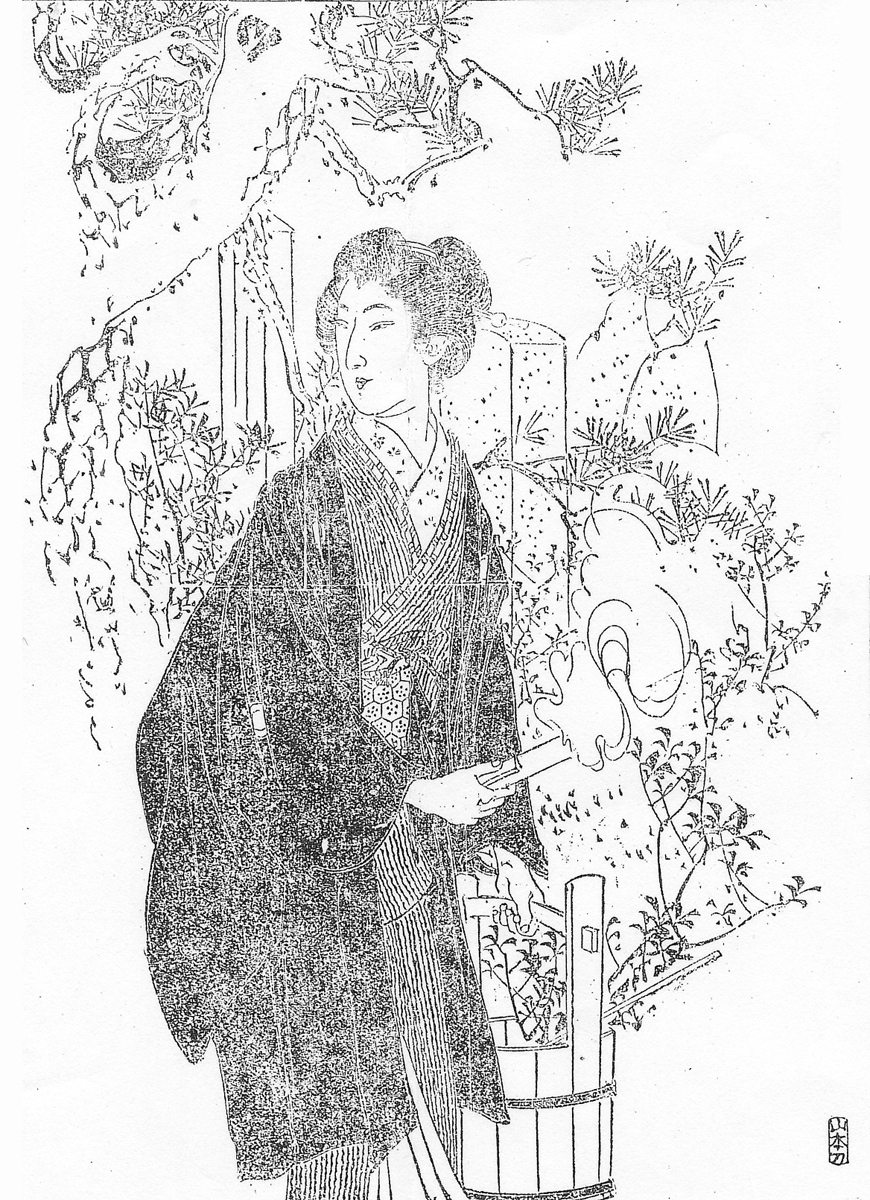 | 説明 | 月々、亡き父親の命日に菩提寺の墓地を訪れる娘。1月のその日は、「朝の間に沐浴(ユアミ)しつ髪も結わせて支度整えて」でかけた。女は風邪で二,三日床についていたので、黒紋附の羽織は寒さの用心のため。女の羽織は礼装ではない、ということになってはいるが、かならずしもそうではなくなってゆく。左手に提げた閼伽(アカ)桶に入っているのは樒(シキミ)の小枝だろう。3月頃には樒も花をつけるが、それよりも枝に香りがあるため、一年を通じて小枝を仏前に備える習慣があった。髪を結わせて、とあるのは、いつもは束髪のため自分でまとめてしまい、外出のときだけ髪結いを呼ぶのかもしれない。その髪型が何かは、印刷が不鮮明なため明らかでない。(大丸 弘) |