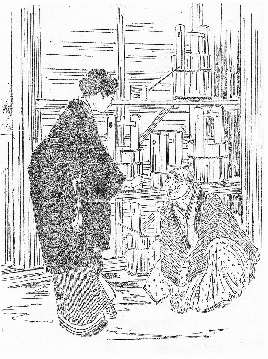 説明 毎月の命日に亡き父の墓参を欠かさない今年二十七になる娘。風邪のため三,四日遅れて寺を訪れ、思いがけない人を垣間見る。それは長いこと行方の知れなかった許婚の男性だ。第16回は墓守の元使用人を、積み上げてある閼伽(アカ)桶のもとで問い詰めている。使用人は奉公をやめても御主人様との身分関係は消えなかった。第17回は嫂から、第18回は兄から、長いあいだ懇望している身分ある求婚者との結婚をつよく勧められている。しかし娘は親のきめた婚約者が生きているかぎり、兄たちには従えないと。娘の恰好は墓参のときのまま。娘の髪は一見銀杏返しのようだが、前髪も横鬢(ビン)も髱(タボ=後ろ髪)も極端に小さい。女中の髪などにはこれに近いものもあるが、大家のお嬢さまの結うものではない。あるいは一種の束髪とも見られる。第33回で「手づから束髪を結い終わり」とあるのがこの髪型に近いことを見ると、束髪の変種という可能性は十分ある。(大丸 弘)