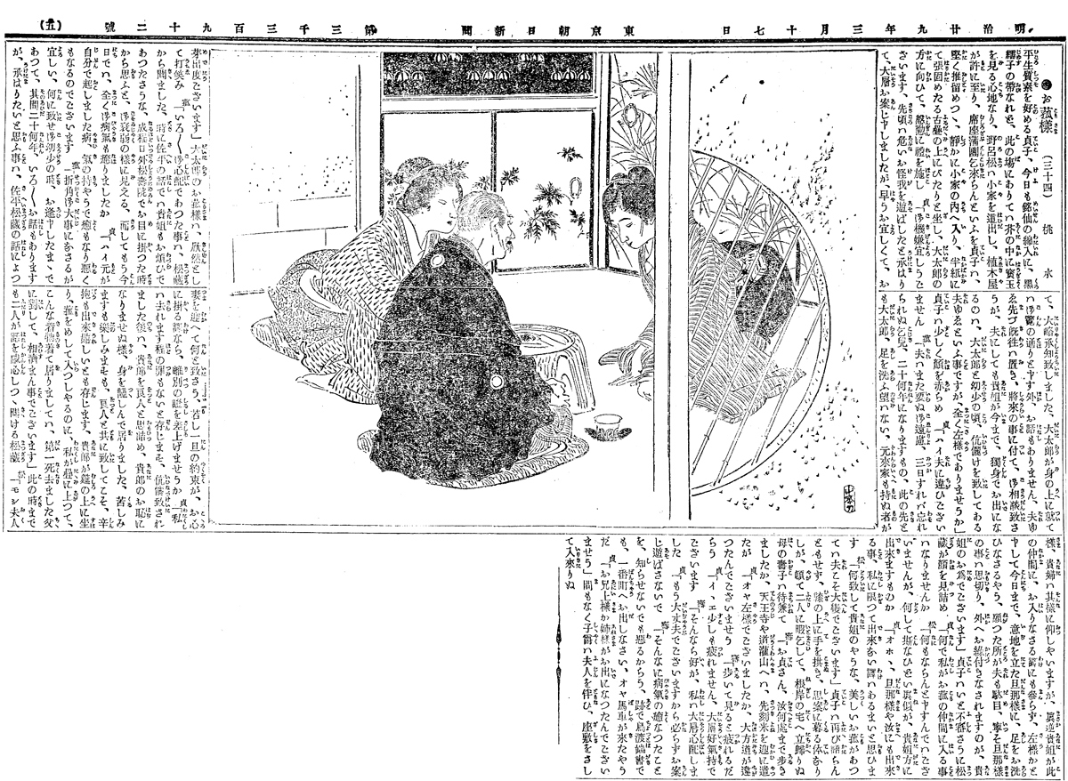 | 説明 | 子爵家の令嬢が、家と家とで取り決めた縁談を婚礼のその日になって捨て、身の回りのもの一切を捨てて、乞食暮らしの男のもとに奔(ハシ)る、という奇談。ヒロインはその日の朝は「疾く起出で先ず鏡台に打向かい、手づから束髪を結終わり」、それから湯殿で手水(チョウズ)を使っている(第33回)。第34回はそのあと兄夫婦に別れの挨拶をする場面。第35回は乞食仲間の老人の住む陋屋(ロウオク)で三三九度の杯を挙げている。ふつうに見るとこの女性の髪は銀杏返しのようにも小さなふくら雀のようにも見えるのだが、本文では上述のとおり、「手づから結った束髪」と断っている。本文と挿絵の食い違いは新聞小説ではめずらしいことではないが、これもそのひとつの事例だろうか。ただし第35回の髪を見ると、前髪も鬢(ビン)も髱(タボ=後ろ髪)もごく小さく、とりわけ髱など、ないに等しい。壁や障子の傷みや破れをふさぐために、やたらに屑紙を貼りつけてあるのがこの時代の陋屋の特徴。(大丸 弘) |