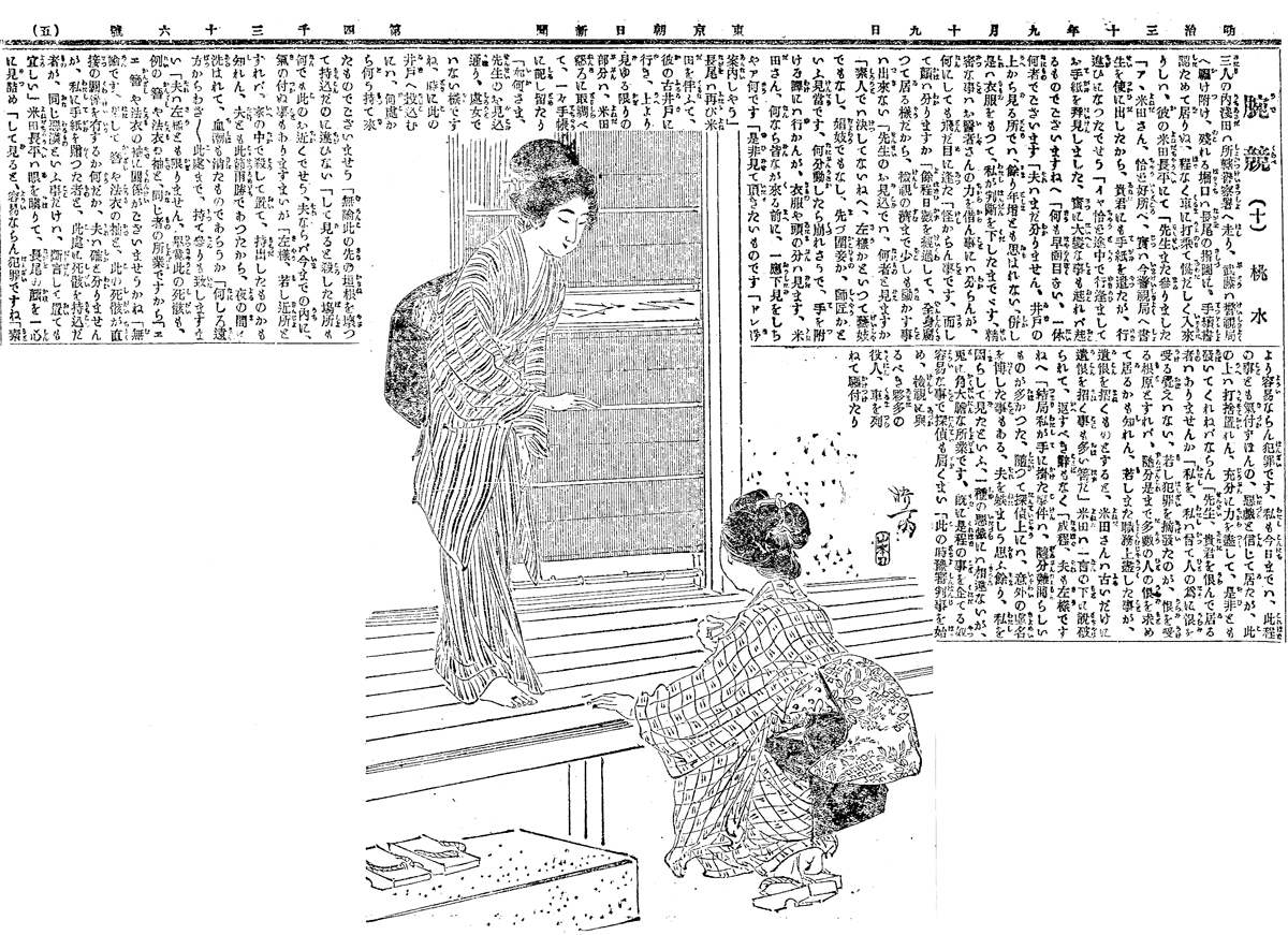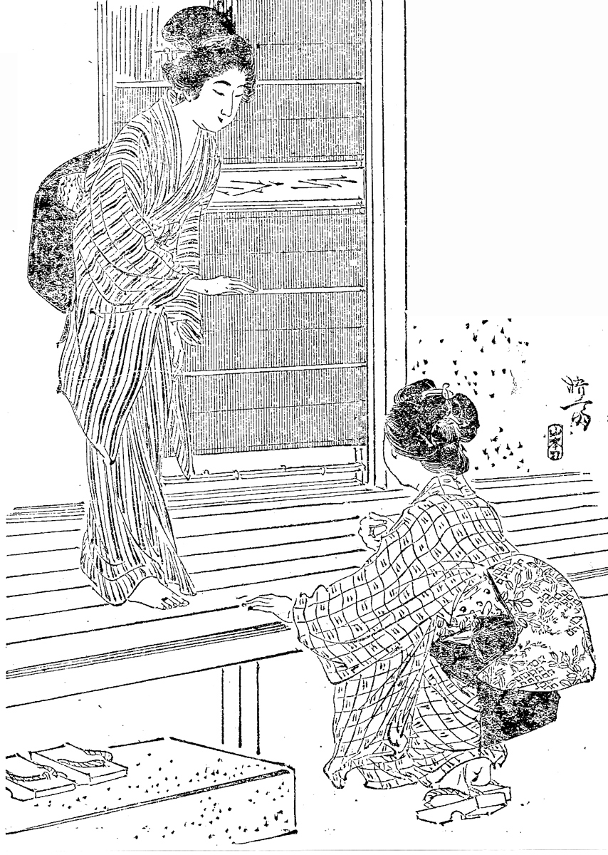 | 説明 | 簾戸を立てた夏座敷の縁先に出て下女に用を言いつけている奥様。この日の本文とは関係ない。奥様の丸髷は三十前後の人妻らしい大きさ。もう曳いてはいないが、足の甲にかぶる裾は現代と比べればやや長め。沓脱石のそばの縁端に手をついてしゃがんでいる女中は、沓脱石の上にあるのと同じ庭下駄を履いている。髪は銀杏返し。仕える人が床の上の主人などと話をする場合は、地面にうずくまり、ときには膝を、また手を地に突いて主人の言葉を「承る」のが主従の礼だったが、この時代ではもう大仰すぎる。しかし縁端に手を置いているのもやや奇妙なかたち。(大丸 弘) |