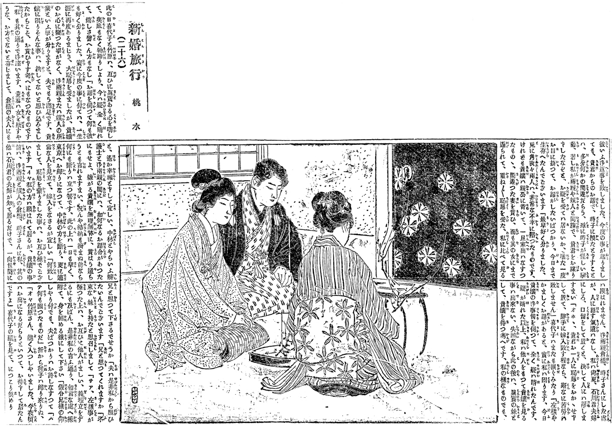 | 説明 | 見合いで互いに気に入ったふたりだったが、継母は実の妹娘の方を嫁がせようと、式では姉妹をすり替えて祝言させ、新婚旅行にも贋の花嫁を旅立たせた。本当の花嫁である姉娘は継母のこの策略を悲しんで家出したが、仮に下女として身を寄せた家で、偽りの新婚旅行から遁れてきた結婚相手と出逢う運命だった。いまは下女の身分のため、質素な縞のきものに髪は銀杏返し。第26回ではこの家の奥さんに命ぜられて、床の間へでも飾る花を生けている。仮に婚礼や披露宴で相手の顔が見られなかったにしても、新婚旅行の東京から逗子までのふたりだけの時間で、べつの相手であることはわかったはずだ。そういう点では新婚旅行という、西洋風習慣の流行は意味があるといえる。この時代の新聞小説のテーマの選び方からして、新婚旅行がもの珍しく、しかもだんだんと普及しはじめたのがこの時代だったことが推測される。坂本龍馬の事例などは風俗としては何の関係もない。(大丸 弘) |