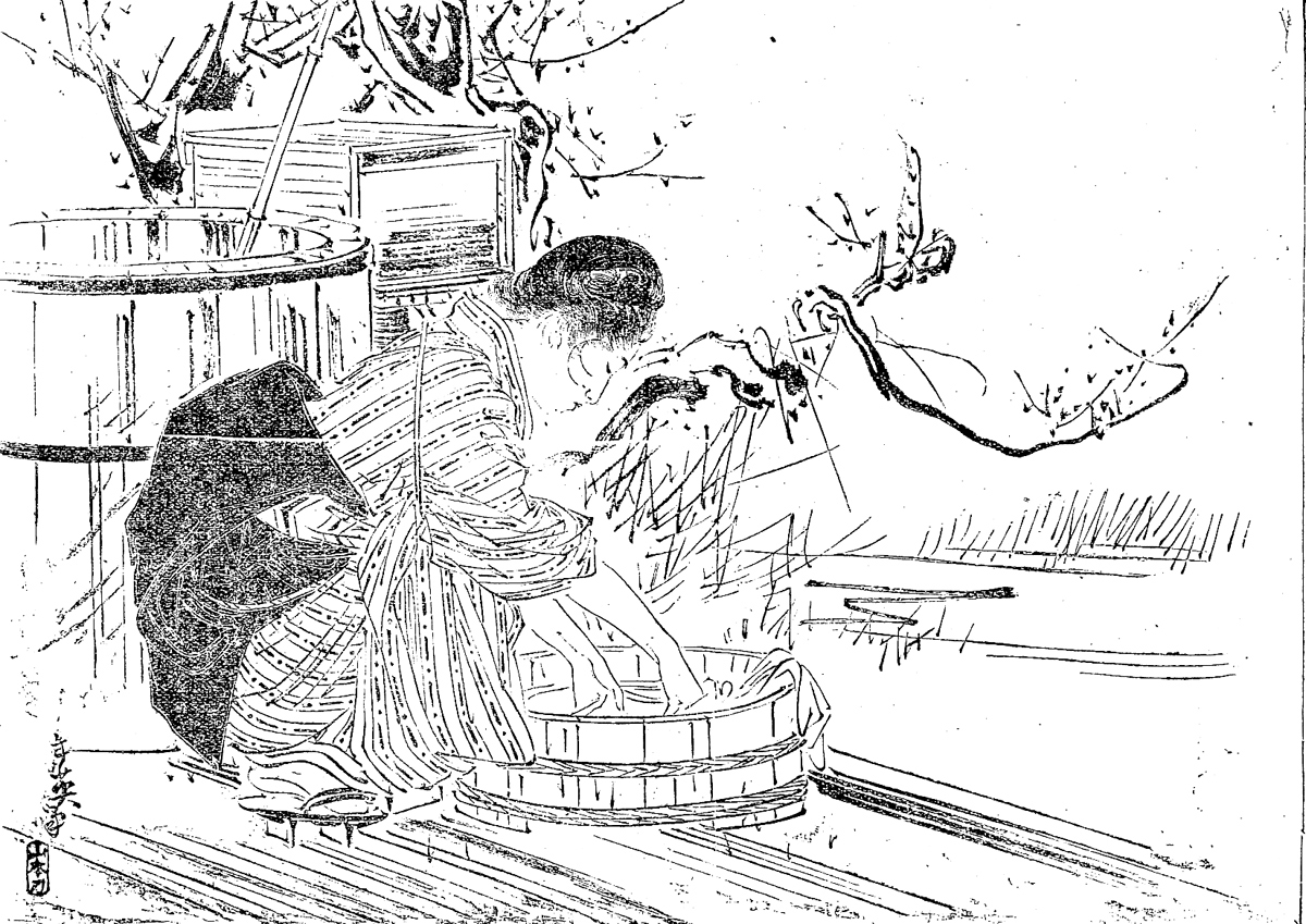 | 説明 | 豊かな家に生まれ育ち、十分すぎるほどの教養も身につけているお嬢様が、自分のために傷を負った駆け出しの巡査のために、誠心誠意の看護をしている。挿絵は巡査の住む長屋の井戸端で洗濯をする姿。井戸側の箱はポンプ用のもの。この頃になると釣瓶で汲み上げるような井戸は少なくなった。お嬢様の髪は下町では見かけることの少ない束髪で、きものも帯の結び様も、一見してこの辺のおかみさんとはちがう。洗濯機が普及するまでは、盥はどんな貧乏家でも必ず持っていた。しかし貧乏家であるほど夏の行水には欠かせないものなので、普通はこんな小ぶりのものではない。(大丸 弘) |