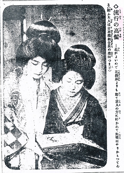 | 説明 | 「品がよいので花柳界よりも却つて素人の方に好かれて此頃はやりかゝってゐる(結ふた人は日本橋組合長の池田まつ子)」。 |