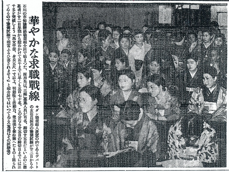 説明 「モダン職業婦人羨望の的であるデパートの女店員採用の予備試験が廿二日から小石川の市知識階級職業紹介所で始まつた、採用先は「三越」募集人員が百名、締切廿五日だといふのに応募者が廿二日早朝から詰めかけて正午までに早くも五百七十名、この分なら廿五日の締切日までには三千名を突破しよう 『高女卒業、身長五尺一寸以上、明朗性と活動力、健康美を兼ね備へたものと限られてゐるので予備試験で相当ふるひ落されませう』と紹介所ではいつてゐる(写真はその試験場)」。
