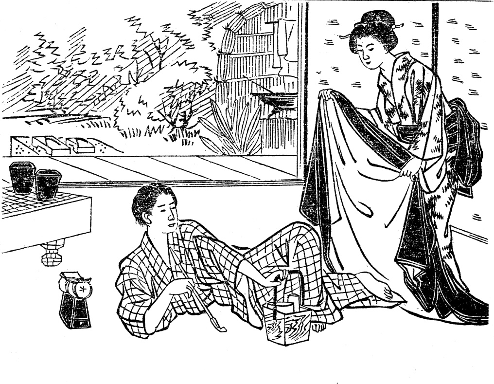 | 身装画像コード | Vyo:[夜着;夜具;掻巻] D805:[やすらぎ・くつろぎの表現;不作法な姿 ex.座る,あぐら,横たわる,喫煙,こたつにあたる] |