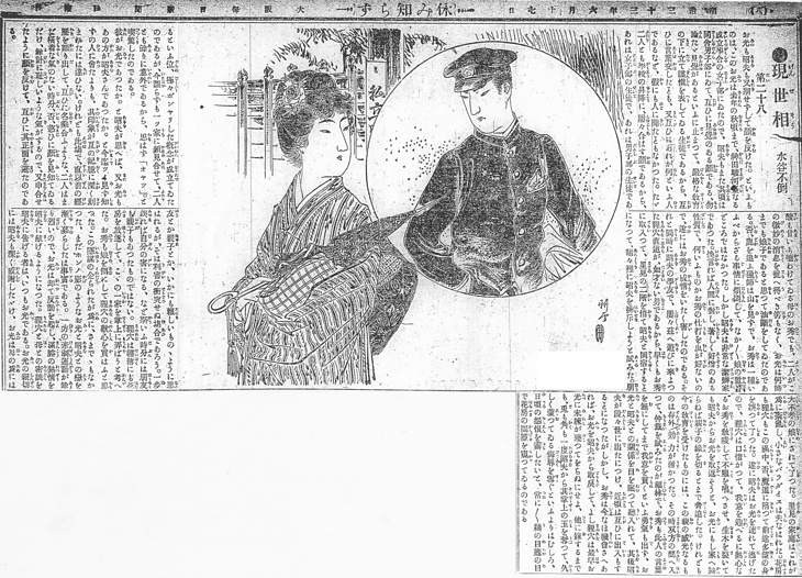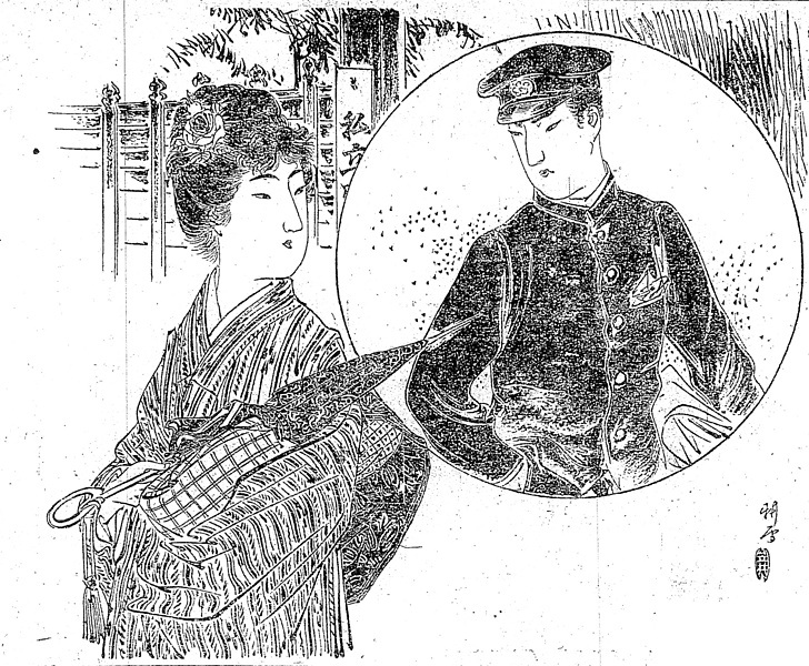| 説明 | かなり込み入った筋書きを早いピッチで推し進めている作品だが、この挿絵に関してはその冒頭、主人公の二人がまだ中学生の時代に、校内でお互いを見知っていたという事情を示しているらしい。二人の後ろに「私立」の看板が見え、文中に成立学舎と学校名を出している。私立成立学舎は神田袋町(現在は駿河台に含まれている)にあった、主として英語を教えていた実在の学校で、夏目漱石も受験勉強に通ったという。男子部と女子部があったのは東京でもめずらしい。この挿絵での男女の出し方は、浮世絵からつづく見返りポーズ。「厳格な教育の下に立って謹慎を示している生徒」同士で、学校の昇降で顔を合わしただけ、ということを示すために一方を丸枠中に入れたようだ。女性は揚巻の束髪で造花を飾っている。(大丸 弘) |