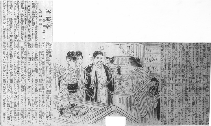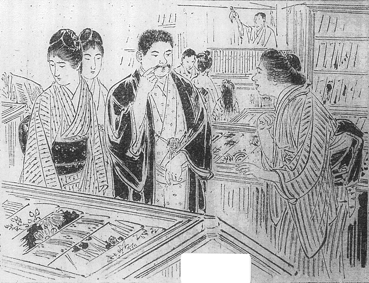 | 身装画像コード | H84:[店舗内(売場)のスペース] D5te:[展示・陳列・収納など] D2so:[束髪(前期縦型の)] D2ma:[丸髷] D3ob:[帯の締め方;帯の位置] D2ot:[男の髪型] D1hi:[ひげ] Vhao:[羽織] |