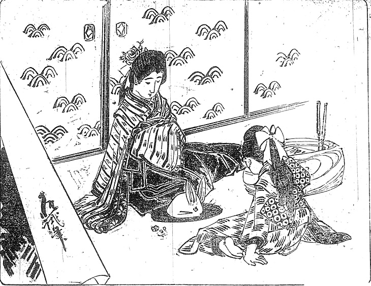 | 説明 | 海洋譚の冒頭で、話は元日の朝の洲本漁港からはじまる。第一回ではヒロインの娘と副主人公の少年との出会だが挿絵はそれとは関係ない。ヒロインの美女は「年頃は十六あまりであろう、茶色の肩掛(ショール)を深う着て、赤糸中形縞の小袖に、節糸織の下着、赤い唐縮緬のフキを厚う見せて、小さい深張の蝙蝠傘をさして居る」等々。その外出すがとこの場面の身なりが同じだとすると、これは一般的な女学生の恰好。胸高に袴をはき、「だらりに結うた髷の端を渦巻かして(……)」という言い方は少しわかりにくいが、下げ髪の根を小さく巻いているのだろう。これは当時マーガレットといわれた束髪に近いことになる。女学生はふつうは家に帰ると袴を脱ぐものだが、お正月ということで改まった恰好。前に座っている女の子は、姉と同じように下げた髪が、大きくやの字に結んだ帯の上にかぶさっている。(大丸 弘) |