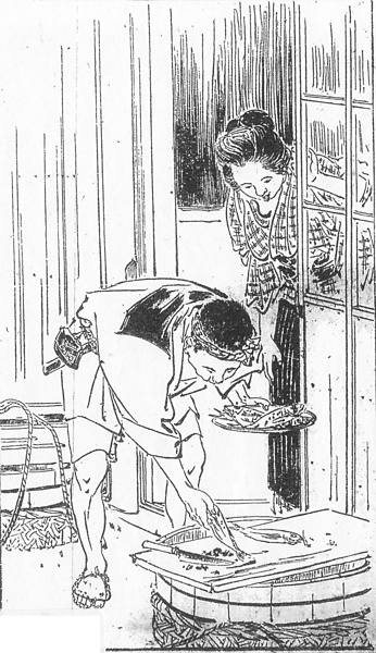 | キーワード | 勝手口;魚屋;呼び売り;ねじり鉢巻き;白半纏;三尺帯;煙草入れ;莨入れ(たばこいれ);たばこ入れ;素足;わらじ;襷掛け;前垂れ;ガラス格子;桶;まな板;包丁;皿;魚 |