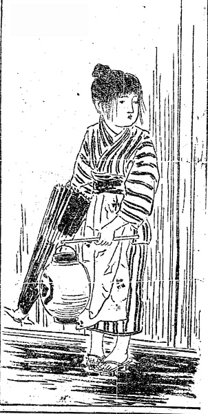 | キーワード | 使用人;つくね髪;竪縞のきもの;細帯;前垂れ;素足;内股;番傘;提灯 |