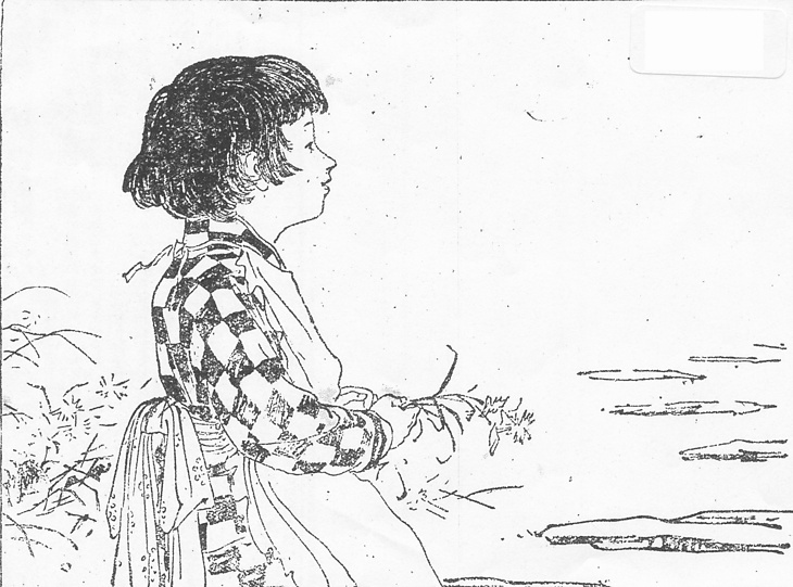 | 説明 | 血脈もの。この日の本文は、ある結婚のいきさつを根掘り葉掘り探ろうとする、意味ありげな会話で終わっている。挿絵の少女はそのことと重要な関わりをもつ存在。しかしここでは、少女のすがすがしいあどけなさだけが強調されている。少女の周囲を、目には見えない暗い血脈が渦を巻いているのだが、それがまた、摘んできた撫子の花を手にもつ、少女のあどけなさを際だたせているように感じられる。改良服風の、石畳模様の筒袖を着て、派手なたぶんメリンスの帯を締めた少女は、西洋風の大きなエプロンをしている。たっぷりした髪の毛をオカッパにして、唱歌をうたいながら歩いている。(大丸 弘) |