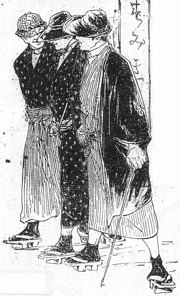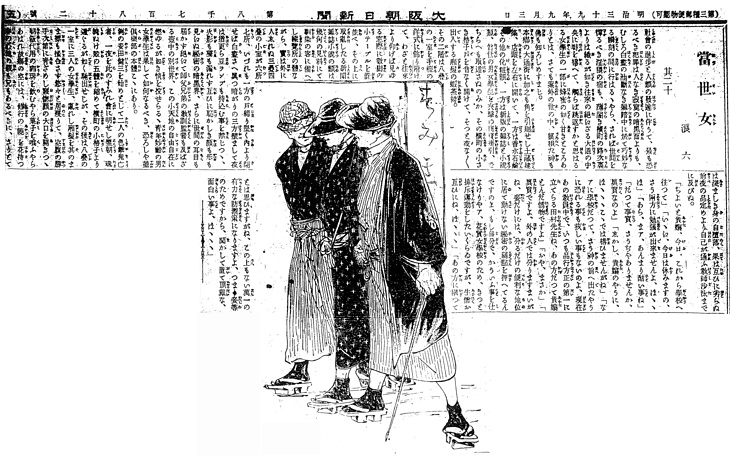 | 説明 | この時代の、女学生に対する偏見のつよさを示すよい例となる作品。本郷の大通りに面した、学生相手の商店の二階が、じつはすみれ会という可憐な名を持つ、学生女学生相手の連れ込み宿である、という暴露。作者の村上浪六はその各部屋について、広さは三,四畳で戸口以外の三方は壁、灯火の持ち込みは許さない、「互いに恥ずかしき顔も形も見えぬ秘密の暗黒界」と書いている。挿絵はその明くる朝、女性たちを残して宿をたちいでる三人の男子学生。場所が本郷だからといって帝大の学生とはきまらないが、三人の身拵えは、大学生が制服を着ないときの標準といってよい。絣のきものに小倉の袴、紺足袋に両刳の駒下駄、きものの裾も袴の裾も短めで脛(スネ)が見えるが、羽織は逆に長めの書生羽織、カラーの突き出ているシャツは滅多に洗うようなことはないから、カラーとカフスは汚れ放題、帽子は勝手気ままで、このころは鍔(ツバ)の広いハットが流行していた。(大丸 弘) |