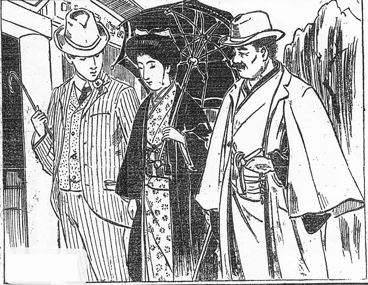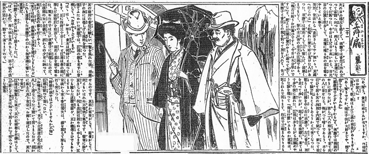 | 説明 | 女優をヒロインにした新聞小説のもっとも早いものか。帝劇の女優募集は翌々年のこと。ただしこの作品に見るように小劇場での女優の出演はかなり前からあった(→年表〈事件〉1891年6月 「川上音次郎らの書生芝居中村座で興行して好評」1891年6月;→年表〈事件〉1905年6月 「大阪弁天座で〈日本女優大会〉開催」大阪毎日新聞 1905年6月15日7面)。この時期までの女優はほとんどが花柳界出か、芝居の空気を吸って育った女性かだったため、社会的にはずいぶん低く見られ、卑しめられていたとさえ言える。もっともこれはわが国にかぎったことではないが。第21回の三人の右側、ヒロインの左に連れ立っている男はこの一座の金主で、女優に対してはまるで旦那のような態度をとっている男。この人物の着ている二重廻しには外套のようなテーラード・カラーがついている。二重廻しは一般に、洋服の上にも和服の上にも着ることができるもの、となっているが、このような洋服風のスタイルはインバネスというべきだ、という人もある。ともあれ、少なくとも着る人は、そんな名称にも、スタイルの部分的特色にも、あまり頓着しなかったのだろう。(大丸 弘) |
