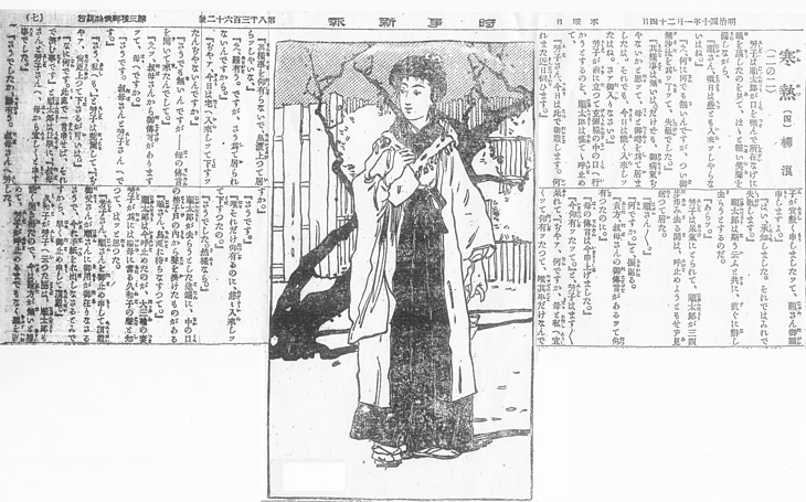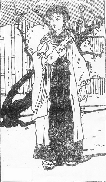 説明 女学生のごく標準的な立ち姿。十七,八の女学生は、学生らしく小さめの束髪に造花を飾り、中振袖くらいの長い袂のきものの襟元はフリンジの付いた襟巻で塞いでいる。袴の裾から見える履物は女学生の場合、たいていは重ね草履。右手に抱えているのは教科書など学用品の入った紫色の袱紗、とよく言われるが、必ずしも袱紗でなくても、少し前の時代から流行り出している信玄袋、千代田袋、三保袋(ミホブクロ)など、さまざまに工夫されている新発売の袋類でもあったろう。革製のバッグ類は女学生の持ち物にはなっていないようだ。下げたもう一方の手にはパラソルを持つ。洋画家の渡部審也の描いている女性は浮世絵美人を脱しはしたが、だれを描いても二重瞼の審也顔。また、従来の日本画系の挿絵画家に比べると部分的な省筆がいちじるしい。この点は、挿絵のリアリティーに頼りたい風俗研究者にとっては困ったこと。(大丸 弘)